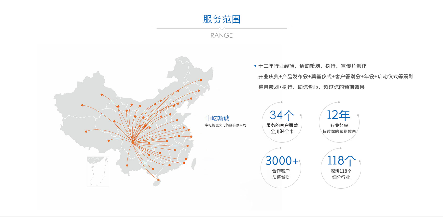 歷經多年深耕,公司已形成 “公關活動、展覽展示、品牌戰略服務、影視制作” 四大核心業務板塊。從創意策劃到落地執行,從品牌塑造到視覺呈現,從活動運營到影像記錄,中屹翰誠始終以專業視角與創新理念,滿足客戶多元化需求。憑借出色的服務品質與專業能力,公司在市場中穩步前行,服務版圖已拓展至政府、金融、媒體、演藝、建筑等 118 個細分行業,與超 3000 家客戶建立深度合作關系,以實力贏得廣泛認可與信賴。